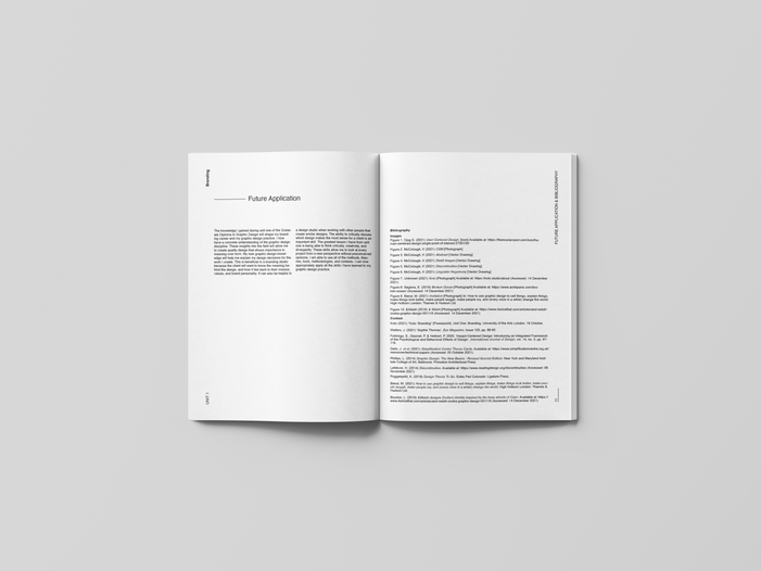 The branding manual is an edited and designed selection of significant references from my research with critical reflection on how they are relevant to my practice. This research was completed during unit one of the Graduate Diploma in Graphic Design at UAL.